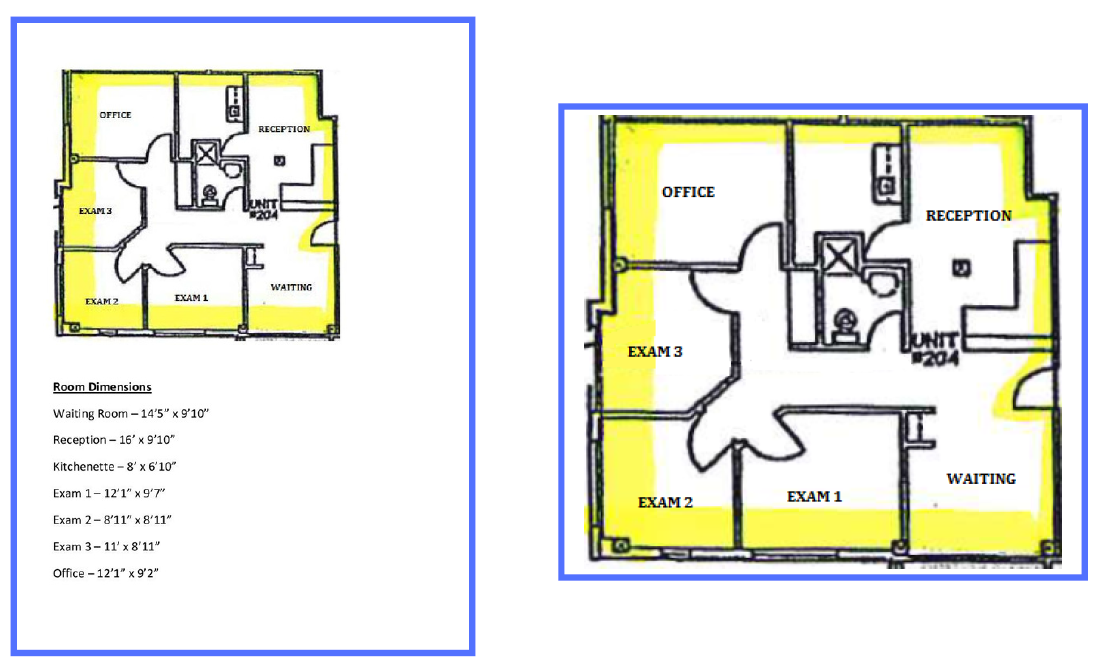Unit 204 is Built-out with reception area, waiting room, washroom, 5 exam room/ large offices